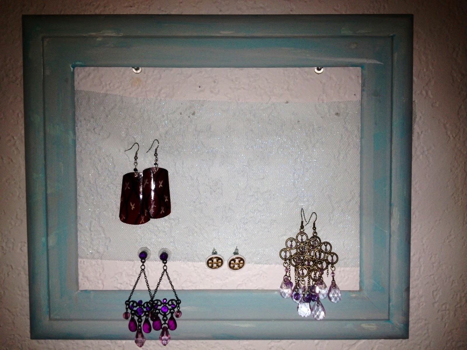 So that red tinted 8×10 picture frame? This would be it. It has a piece of tulle attached to the back to hold the earrings. Saw the idea on pinterest (of course) and had to go with it! So happy with how it came out!