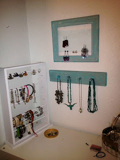 Here’s that strange little wood strip that had the hooks on it! It is now a necklace holder! I had preciously been using a hanging jewelry box, and boy was it bulky, not to mention, I had had it for over 6 years and it was showing its age! Glad it’s gone and that I now have some cute new jewelry holders!