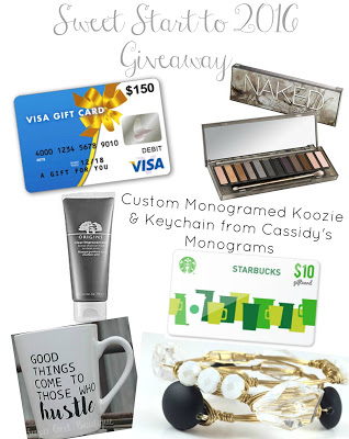 $150 Visa giftcard // Naked Smokey Palette // Origins Clear Improvement Active Charcoal Mask (3.4 Oz) // $10 Starbucks giftcard // Custom wire wrapped bracelets from Courtney & Courtnie // Custom Monogramed koozie & keychain from Cassidy’s Monograms // “Good things come to those who hustle” mug from The Sugar Creek Shoppe